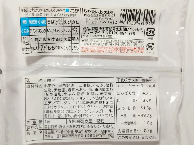 熱量:344kcal、たんぱく質:4.9g、脂質:13.6g、炭水化物:51.5g(糖質:49.7g、食物繊維:1.8g)、食塩相当量:0.8g