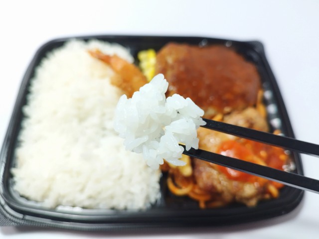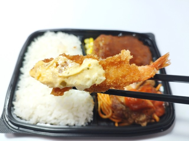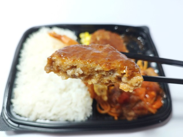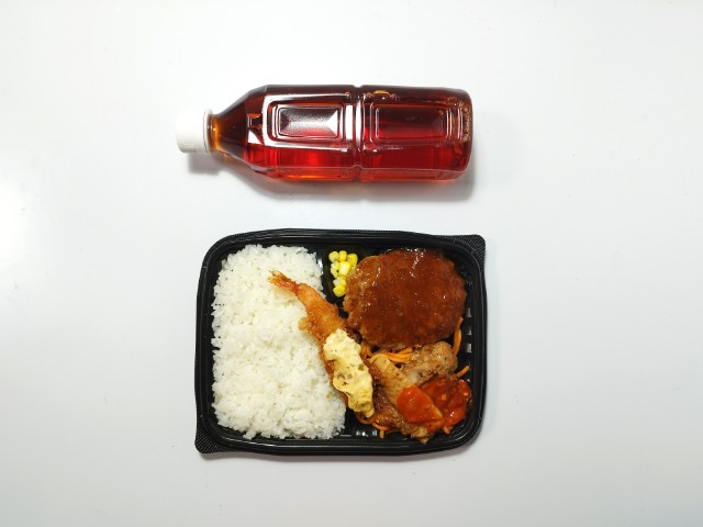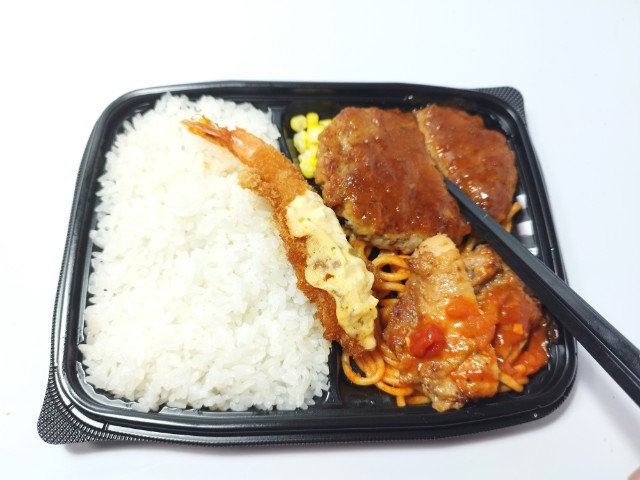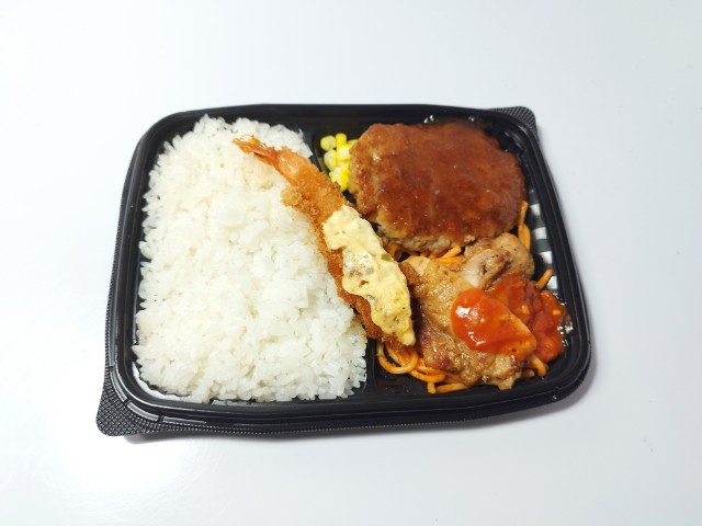ハンバーグやチキンステーキ、エビフライがのったお弁当です。以前の購入が2023年11月28日発売だったので、2年以上経っていますが、価格が550円(税込594円)から698円(税込753.84円)に変わっています。そんな洋食ミックス弁当ですが、ハンバーグはふっくらとした食感とジューシーな肉質、和風おろしソースのさっぱりとした味わいがあって、間違いのない美味しさです。チキンステーキは鶏の旨味と弾力のある肉質、ガーリックトマトソースの濃厚な味わいで、ご飯が進む一品になっています。海老フライは海老のプリっとした食感とタルタルソースのほどよい酸味があって、美味しいのひと言です。他にもスパゲティやコーンがのっていて、最後のひと口まで飽きることなく食べられます。内容量は1食分にちょうどよく、お腹も満たされます。ぜひ洋食ミックス弁当を食べてみてください。