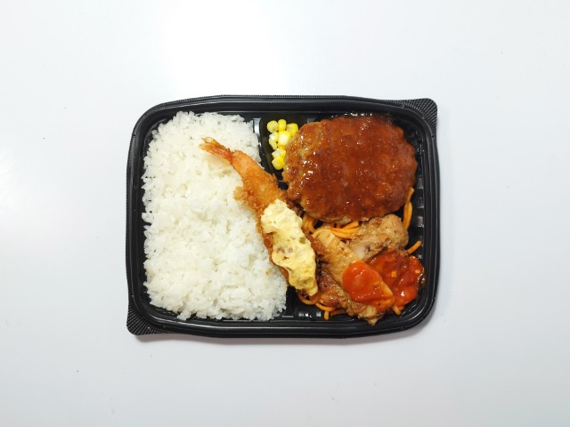 ハンバーグ、チキンステーキ、エビフライと洋食の定番人気おかずを盛り合わせたお弁当です。