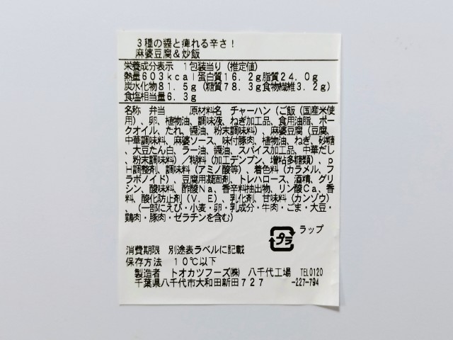 麻婆豆腐と炒飯のワンプレート弁当です。以前の購入が2023年12月5日発売なので約2年近く経っていますが、価格が554円(税込598円)から591円(税込638円)に商品名が醤が決め手の麻婆炒飯から3種の醤と痺れる辛さ!麻婆豆腐&炒飯へと変わっています。そんな麻婆豆腐&炒飯ですが、麻婆豆腐は醤の旨味とほどよい辛味、花椒の痺れがあって、ハマってしまう美味しさです。炒飯はしっとりとした食感とたまごの甘味、ねぎの風味があって、麻婆豆腐との相性抜群です。それぞれ単品で食べても美味しですが、やはり合わせて食べる事でよりその美味しさを楽しめます。内容量は1食分にちょうどよく、お腹も満たされます。ぜひ麻婆豆腐&炒飯を食べてみて下さい。