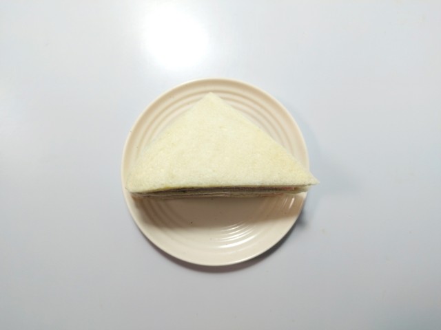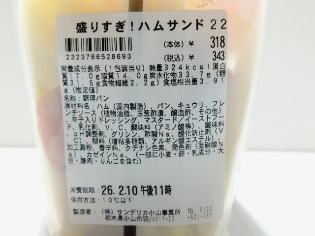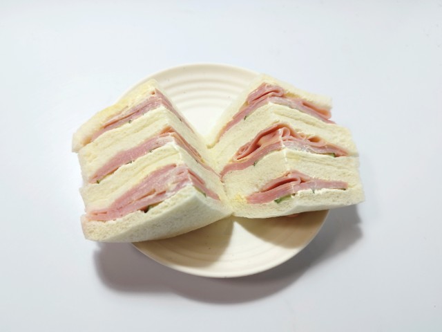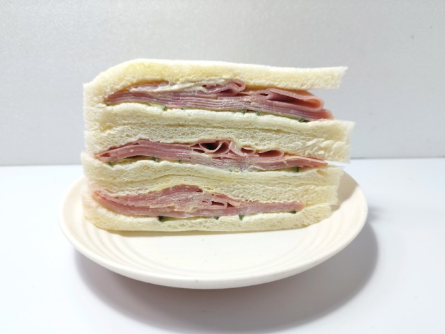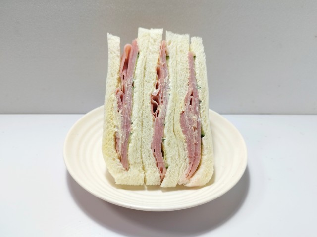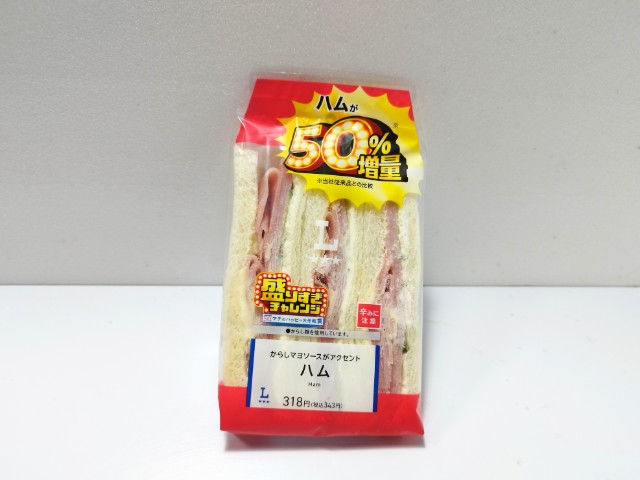 ハムを挟んだサンドイッチです。以前の購入が2025年11月18日発売なので約3ヶ月近く経っていますが、価格は変わっていません。ローソンでは1月27日より「盛りすぎチャレンジ」を開催していて、今回の商品も対象商品の一つになっています。内容としてはハムお値段そのまま50%増量(従来品との比較)になっているらしいです。そんなハムサンドですが、サンドイッチ生地ふんわりとした食感小麦の風味で、安定の美味しさです。具材のハムは何枚も重ねてあって、ハムの味わいほのかな塩味を楽しめます。また、今回はハム増量されている事もあって、ハムの食感もしっかりと楽しめます。きゅうり食感のアクセントになっていて、ハムとの相性も抜群です。ポイントはからしマヨソースで、ハムサンドといえばの定番の味で美味しいのひと言です。大きさは普通のサンドイッチサイズよりやや多めで、朝食小腹が空いた時にピッタリです。ぜひ盛りすぎ!ハムサンドを食べてみてください。