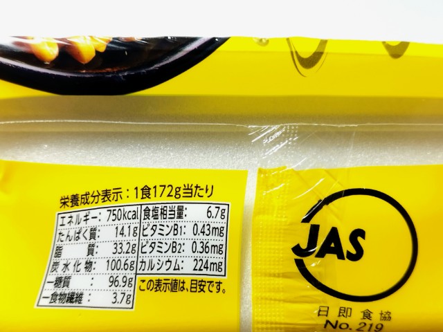 熱量:750kcal、たんぱく質:14.1g、脂質:33.2g、炭水化物:100.6g(糖質:96.9g、食物繊維:3.7g)、食塩相当量:6.7g