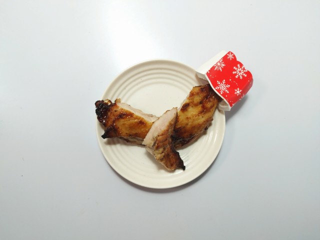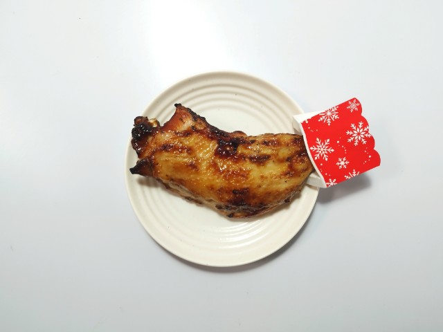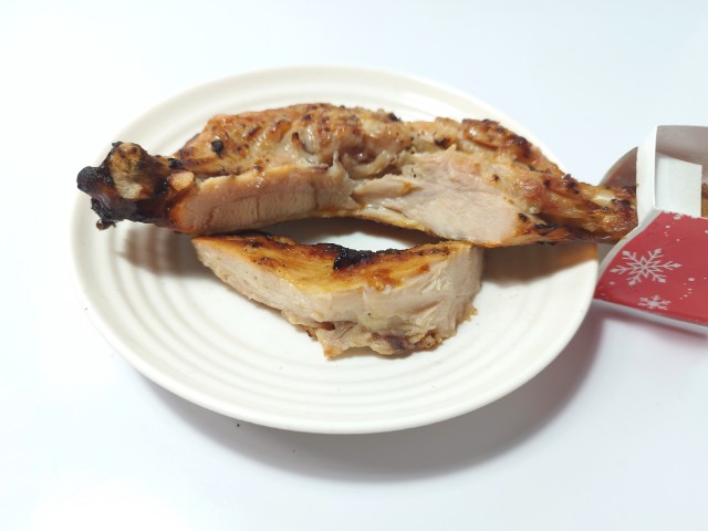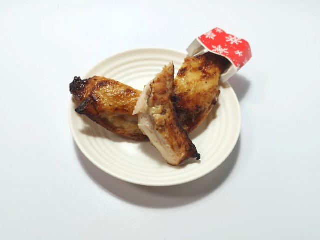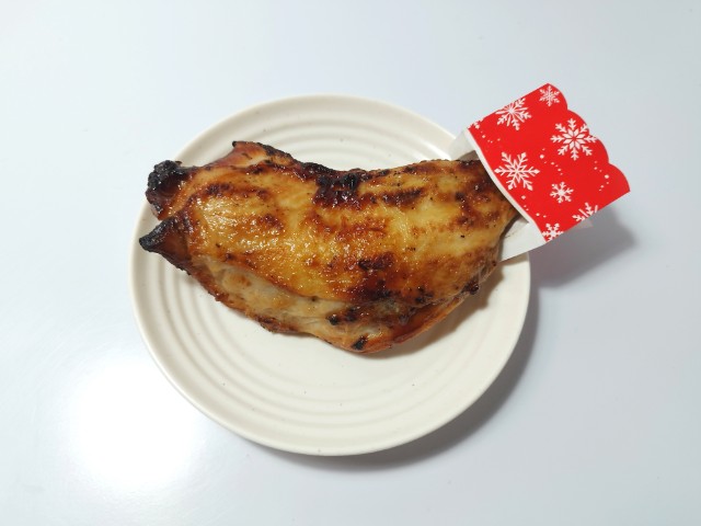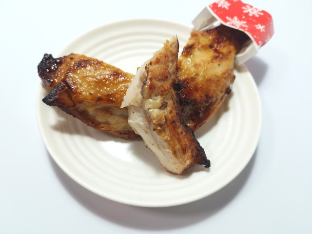 炭火で焼かれたローストチキンです。以前の購入が2024年12月17日発売だったので、約1年近く経っていますが、価格は変わっていません。そんなローストチキンですが、皮目はタレの甘辛さと香ばしい味わい、炭火のほのかな香りがあって、間違いのない美味しさです。中の鶏肉はしっとりとした食感とジューシーな脂で、美味しいのひと言です。ななチキや揚げ鶏といったフライドチキンとはまた違って、ジューシーで肉厚ながらも食べ進めやすく、この時期にピッタリの商品だと思います。大きさは一人分にちょうどよく、おつまみや小腹が空いた時にピッタリです。ぜひ炭火焼きローストチキンレッグを食べてみて下さい。