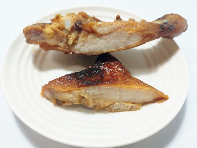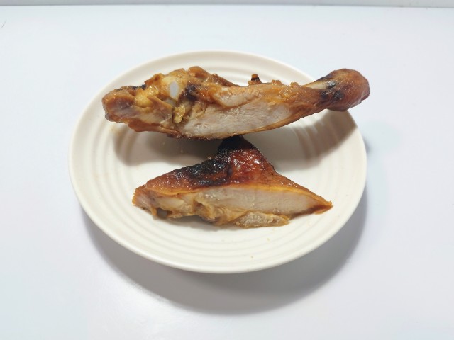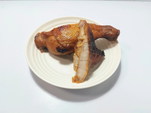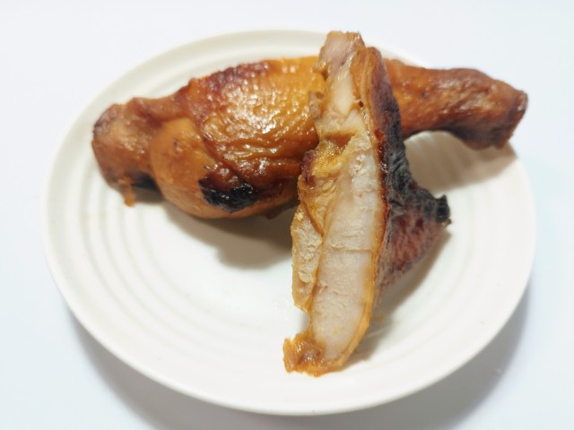 直火焼ローストチキンです。以前の購入が2024年12月17日発売だったので、約1年近く経っていますが、価格が408円(税込440円)から462円(税込498円)に商品名が直火焼ローストチキンレッグ(骨付き)から直火焼ローストチキンレッグへと変わっています。そんなローストチキンですが、香ばしさ甘辛い味付けで、美味しいのひと言です。中の鶏肉弾力ある肉質ジューシーな脂があって、食べ出すと止まらなくなります。見た目からも分かるように綺麗に焼かれたローストチキンは、味のバランスが良くて、食べ応えもしっかりとあります。大きさは一人分にちょうどよく、おつまみ小腹が空いた時にピッタリです。ぜひ直火焼ローストチキンレッグを食べてみて下さい。