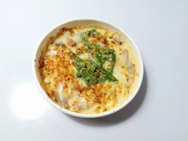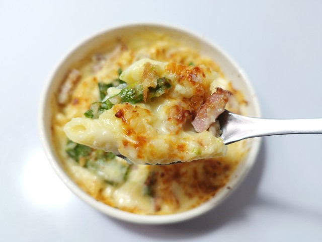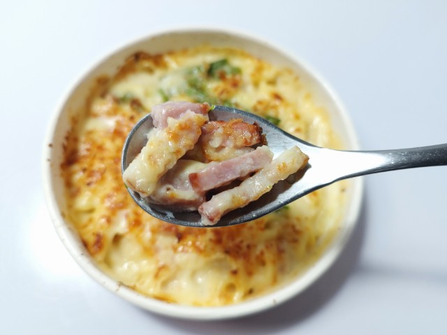アスパラガスとベーコンを使ったグラタンです。以前の購入が2025年4月2日発売だったので、約1年近く経っていますが、価格が460円(税込496.80円)から480円(税込518.40円)に変わっています。そんなグラタンですが、もちっとした食感のマカロニとホワイトソースの濃厚な味わい、チーズのコクがあって、間違いのない美味しさです。アスパラガスはシャキッとした食感とほのかな甘み、ベーコンはカリッとした食感とほどよい塩味で、具材同士の相性が良く、味や食感のアクセントになっています。出来立ては激熱なので注意が必要ですが、熱い内に食べるのがオススメです。ぜひアスパラとベーコンのグラタンを食べてみてください。