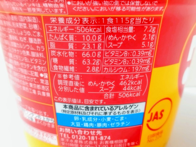 熱量:506kcal、たんぱく質:10.0g、脂質:23.1g、炭水化物:66.0g(糖質:63.2g、食物繊維:2.8g)、食塩相当量:7.2g