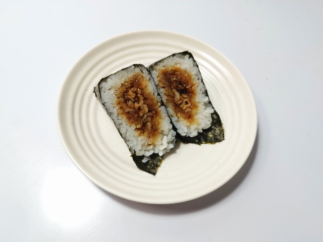 炭火で焼いた牛焼肉を甘辛いタレで味付けしました。食べる直前にパリッとした海苔を巻いて食べる手巻おにぎりです。