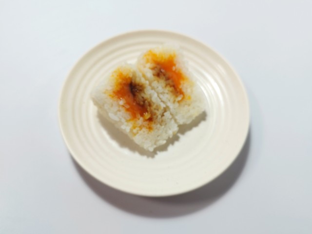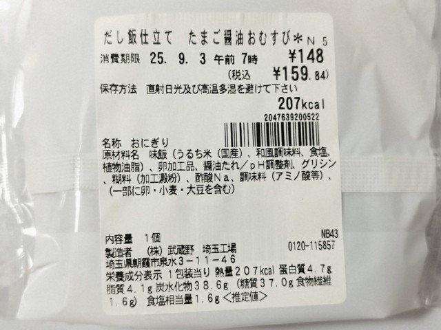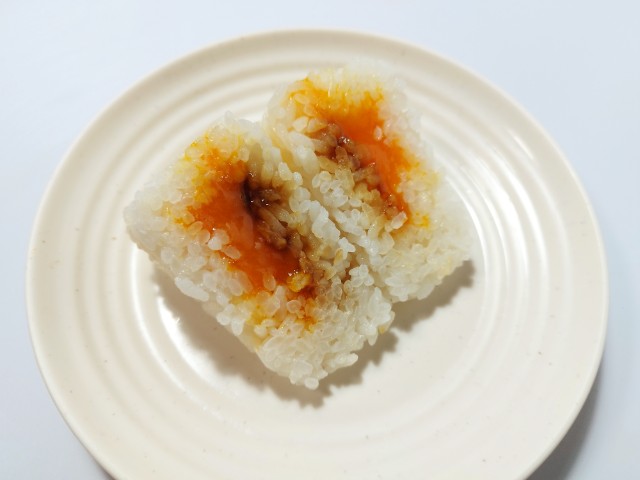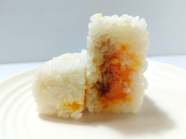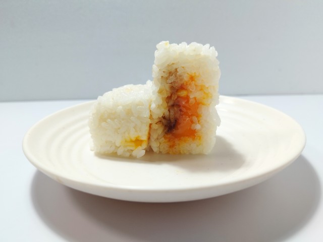 たまごかけごはん風おむすびです。以前の購入が2025年6月3日発売だったので、約3ヶ月近く経っていますが、価格が138円(税込149.04円)から148円(税込159.84円)へと変わっています。そんなたまご醤油おむすびですが、たまごかけごはんをイメージしただけあって、具材には卵黄ソース醤油だれが入っていて、ひと口食べるとたまごかけごはん風なのがよく分かります。あくまでイメージなので、完璧とはいかないまでも、卵黄の濃厚さ醤油の風味があって美味しいです。かなりあっさりとしたおむすびなので、朝からでも美味しく食べられると思います。大きさは普通のおむすびサイズで、朝食主食にあと一品追加したい時にピッタリです。ぜひたまご醤油おむすびを食べてみて下さい。